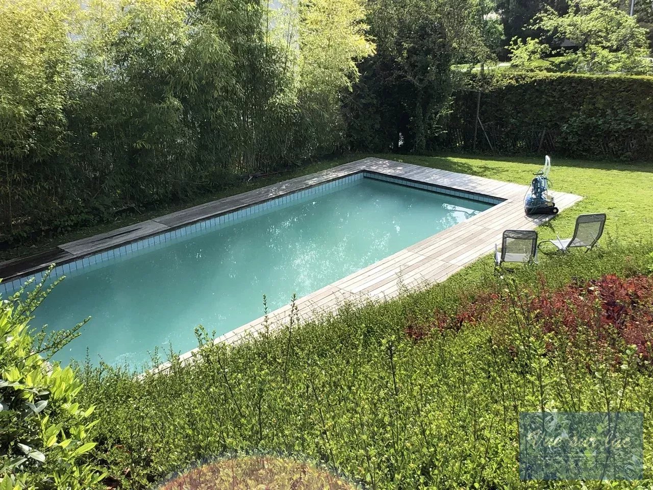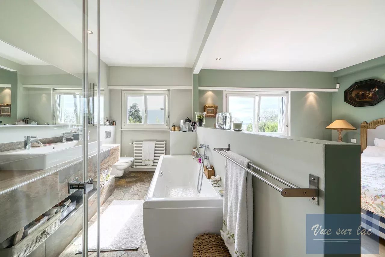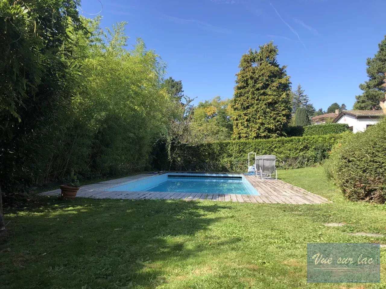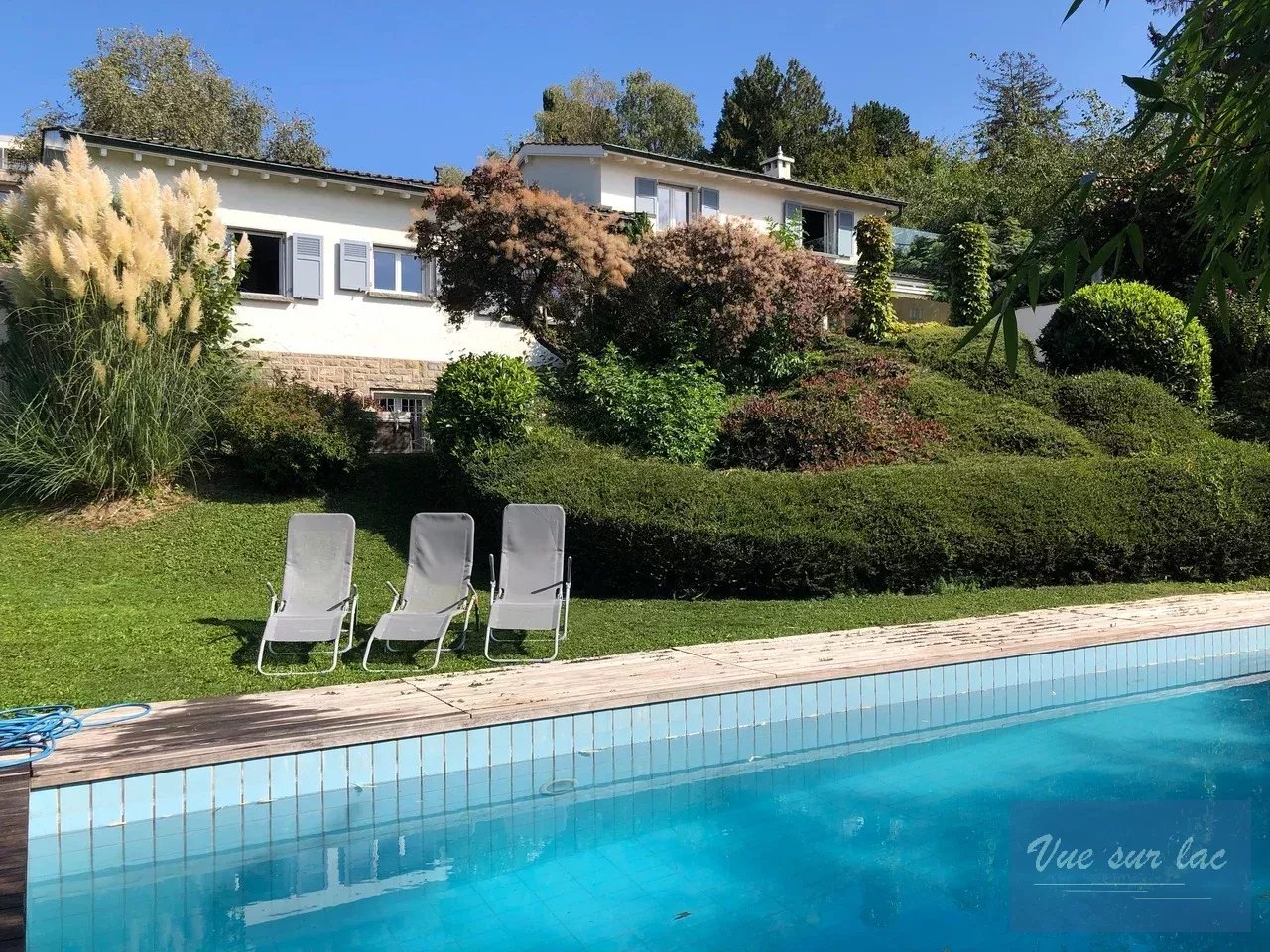 De plus, elle offre un beau et grand jardin joliment arboré avec une belle piscine chauffée et une grande perçée verticale sur le lac et les montagnes.