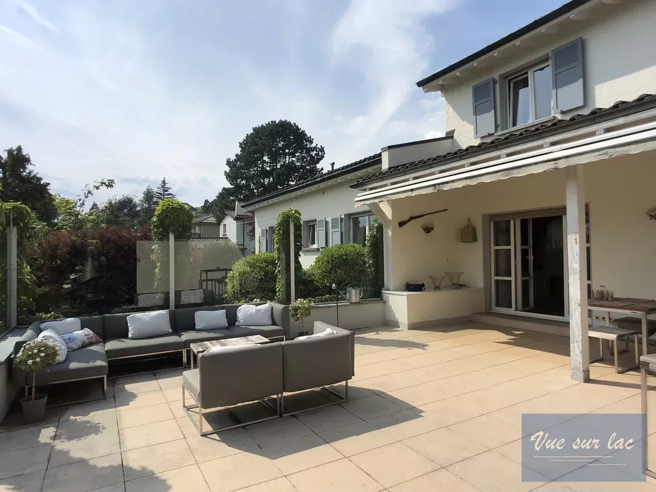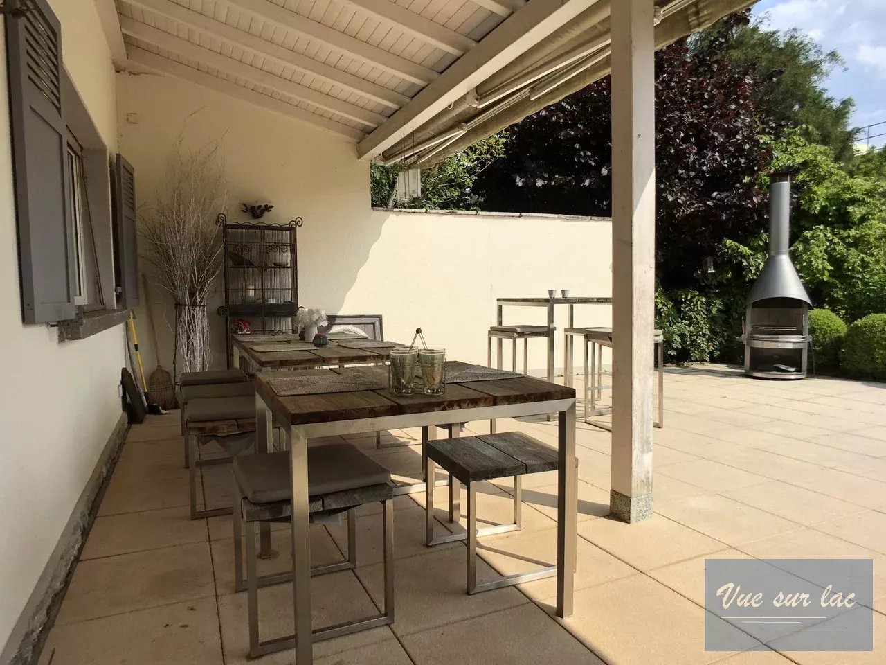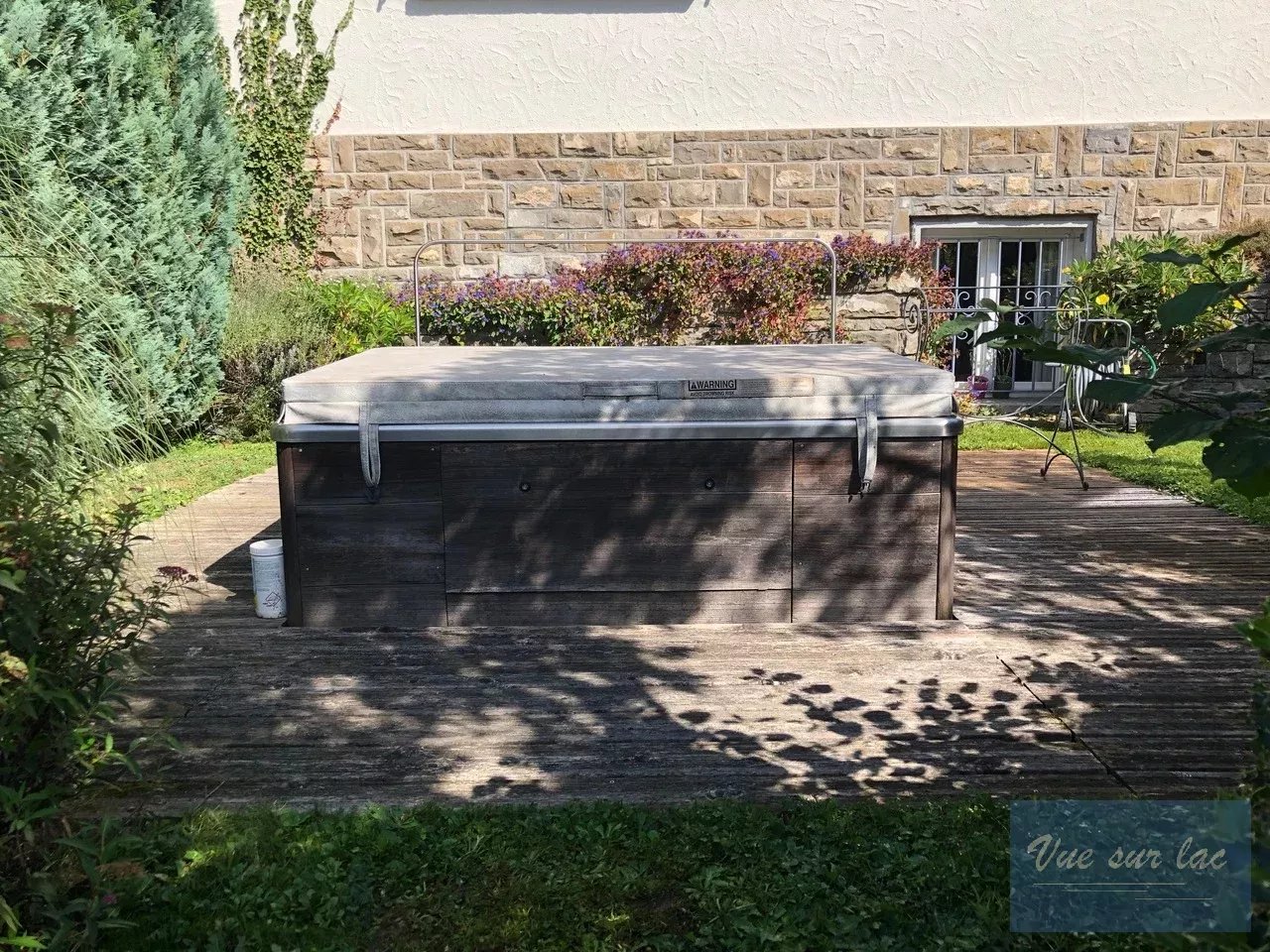 De plus, elle offre un beau et grand jardin joliment arboré avec une belle piscine chauffée et une grande perçée verticale sur le lac et les montagnes.